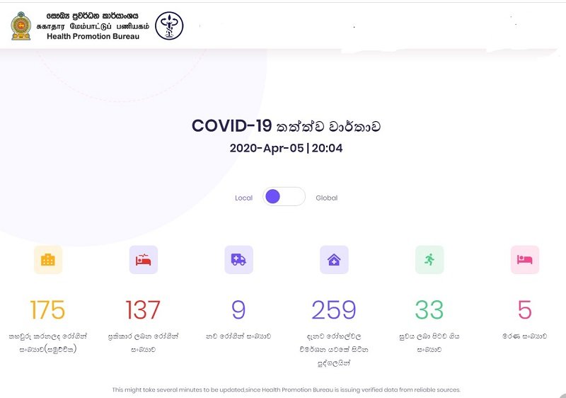 ශ්රී ලංකාවෙන් අද (5) දින පස්වරු 8.00 වන විට වාර්තා වී තිබූ කොවිඩ් 19 ආසාදිතයින් සංඛ්යාව 175 දෙනකු බව සෞඛ්ය ප්රවර්ධන කාර්යංශය සදහන් කරයි. එය වැඩි දුරටත් සදහන් කරන්නේ අද දින තුළ නව ආසාදිතයින් 09 දෙනකු වාර්තා වී ඇති බවයි.