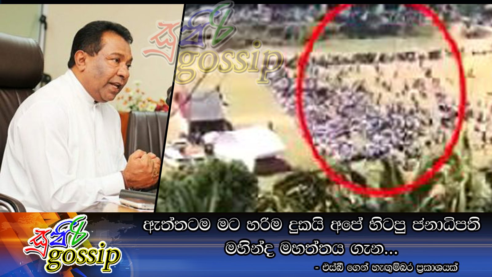 මහින්ද රාජපක්ෂ මහතාගේ ප්රධානත්වයෙන් හඟුරන්කෙත පැවති රැස්වීමට 500ක් වත් සෙනග නොසිටි බවත් ඉන් දැඩි සේ අපහසුතාවයට පත් මහින්ද රාජපක්ෂ මහතාට පැය දෙකක් මාදන්වල පංසලට වෙලා ඉඳල විනාඩි 5ක් රැස්වීම අමතල යන්න වුනු එකට තමාට ඉතා දැඩි දුකක් ඇතිවූ බව එස් බී දිසානායක මහතා ජන රැළියක් අමතමින් ඉතාමත් හැඟුම්බරව ප්රකාශ කර ඇත.එම වීඩියෝව පහතින්,