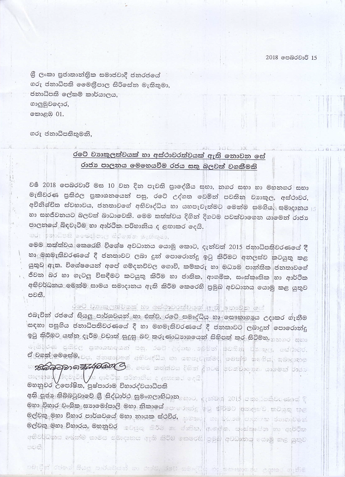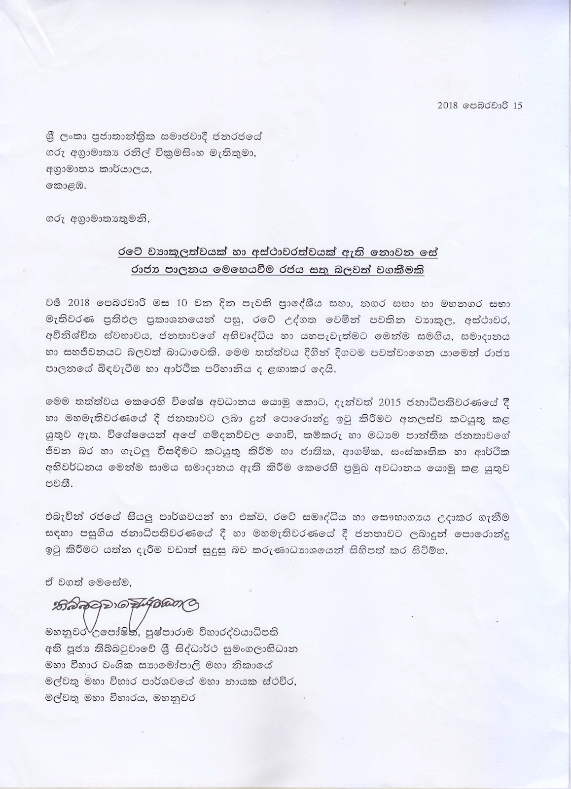 මල්වතු පාර්ශ්වයේ මහා නාහිමි අතිපූජ්‍ය තිබ්බට්ටුවාවේ ශ්‍රී සිද්ධාර්ථ සුමංගල හිමියන් විසින් ජනාධිපති මෛත්‍රීපාල සිරිසේන මහතා වෙත සහ අග්‍රාමාත්‍ය රනිල් වික්‍රමසිංහ මහතා වෙත යොමු කළ සම්පූර්ණ ලිපිය පහතින් දකින්න.