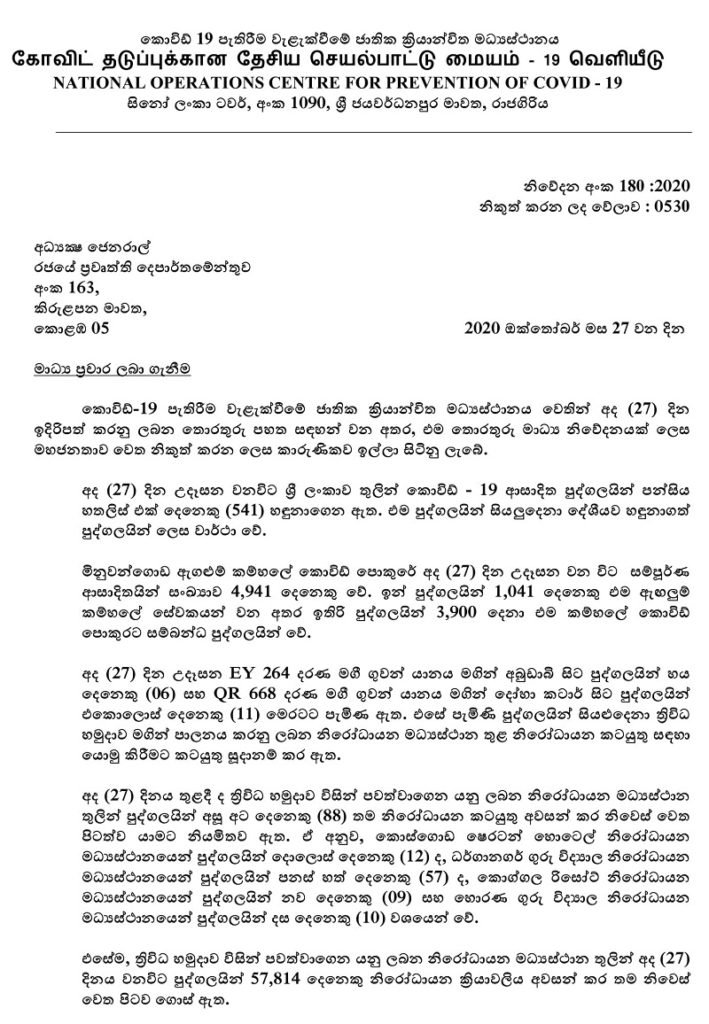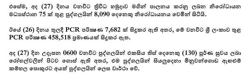අලුතින් හදුනාගෙන ඇතැයි කොවිඩ්-19 පැතිරීම වැළැක්වීමේ ජාතික මධ්‍යස්ථානය විසින් අද දින (27) පෙව. 05.30ට නිකුත් කළ මාධ්‍ය නිවේදනයක සදහන් වේ. එම නිල නිවේදනය සම්පූර්ණයෙන් මෙසේය.