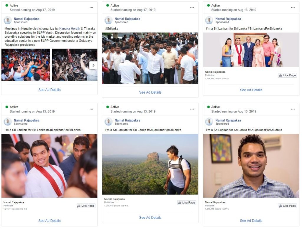 මේ මොහොත වන විටත් ෆේස්බුක් තුල මුදල් ගෙවා වැඩිම ප්‍රචාරණ මෙහෙයුම් ප්‍රමාණයක් සිදුකරන්නේ මන්ත්‍රී නාමල් රාජපක්ෂ වන අතර ඔහුගේ ප්‍රචාරණ දැන්වීම් වල ප්‍රධානම තේමා පාඨය වන්නේ “මම ශ්‍රී ලංකාවට ශ්‍රී ලාංකිකයෙක්මි”. මෙය ඇමෙරිකානු පුරවැසියෙකු වන ජනාධිපති අපේක්ෂක ගෝඨාභය රාජපක්ෂගේ (බාප්පගේ ) ප්‍රචාරණ ව්‍යාපාරයට කෙතරම් රැකුලක්ද, පරහක්ද යන්න දේශපාලනය දන්නෝ දනිති.