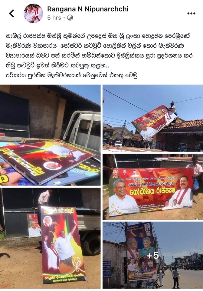 රාජපක්ෂවරුන්ගේ පවුලේ පක්ෂය වූ ශ්‍රී ලංකා පොදුජන පෙරමුණේ ජනාධිපති අපේක්ෂකයා ලෙස පසුගියදා නම් කළ ගෝඨාභය රාජපක්ෂ මහතා පිළිගැනීම සඳහා හම්බන්තොට නගරය පුරා හන්දියක්, කණුවක් ගානේ එල්ලා තිබූ ගෝඨාගේ කටවුට් සහ බැනර් වහාම එම ස්ථානවලින් ඉවත් කරන ලෙසට එම පක්ෂයේ නායක මහින්ද රාජපක්ෂගේ පුත් නාමල් රාජපක්ෂ දුන් නියෝගයකට අනුව ගෝඨාට විජයග්‍රහණයක් පතා එල්ලා තිබු සියලු කටවුට්, බැනර් හම්බන්තොටින් ඉවත් කර තිබේ.