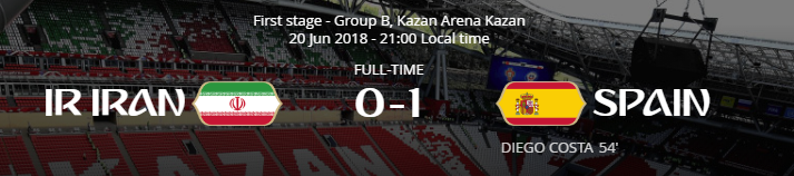 රුසියාවේදී පැවැත්වෙන ලෝක කුසලාන පාපන්දු තරගාවලියේ සිය පළමු ජයග‍්‍රහණය වාර්තා කිරීමට ස්පාඤ්ඤය අද (21) අලූයම සමත් වුණා. ඒ, ගෝල 1-0 ක් ලෙස ඉරානය පරාජයට පත් කරමින්. ස්පාඤ්ඤය වෙනුවෙන් ජයග‍්‍රාහී ගෝලය වාර්තා කළේ දියාගෝ කොස්තා. ඔහු මෙවර තරගාවලියේ වාර්තා කළ 3 වන ගෝලයද මෙය වනවා.
