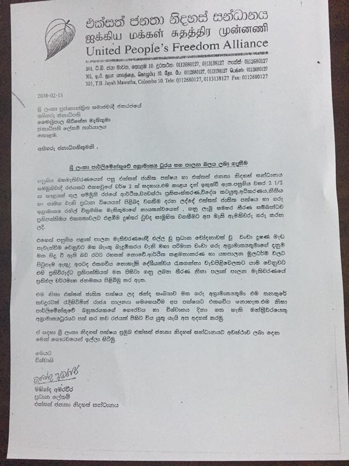 පාර්ලිමේන්තුවේ බහුතරයකගේ ගෞරවය හා විශ්වාසය දිනා ගත හැකි මන්තී්රවරයෙකු අග්රාමාත්යධූරයට පත් කර නව ආණ්ඩුවක් පිහිටුවන්නැයි එක්සත් ජනතා නිදහස් සන්ධානය ජනාධිපතිවරයාට යෝජනා කර තිබෙනවා.
