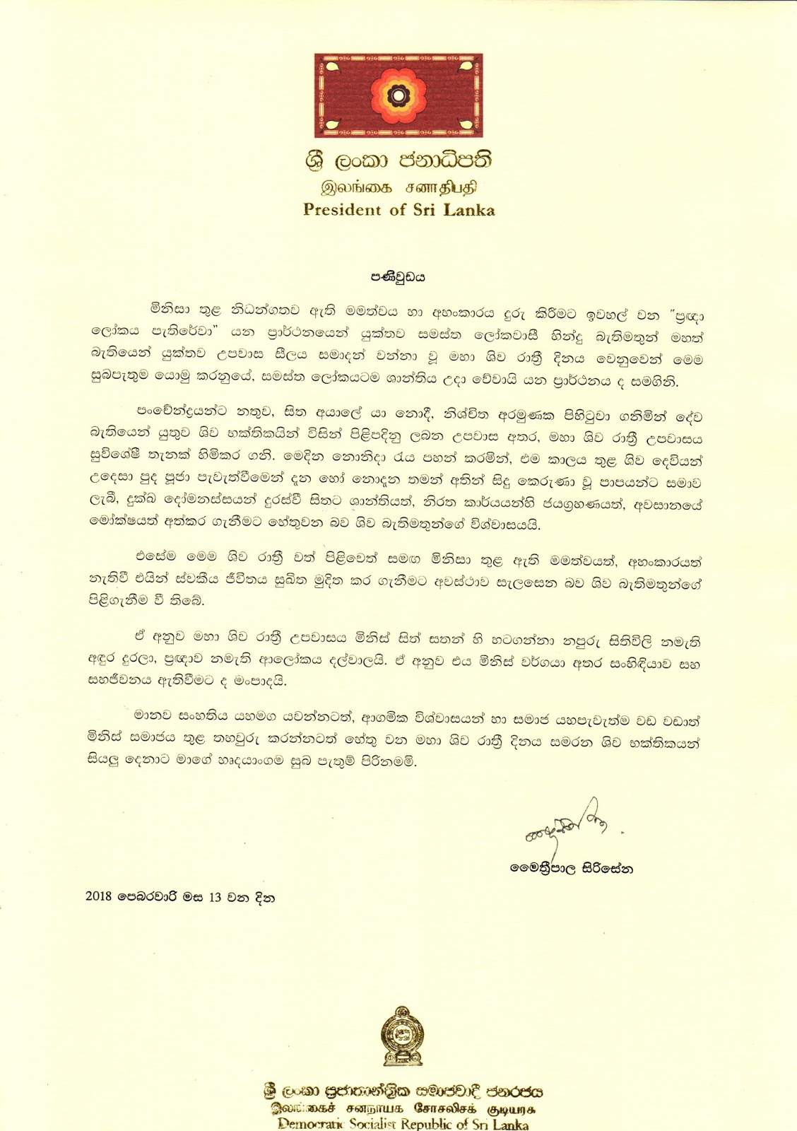 මිනිසා තුළ නිධන්ගතව ඇති මමත්වය හා අහංකාරය දුරු වේවායි යන ප්රාර්ථනයෙන් යුක්තව ජනාධිපති මෛත්රිපාල සිරිසේන මහතා සමස්ථ ලෝකවාසී හින්දු බැතිමතුන් මහත් බැතියෙන් යුක්තව උපවාස සීලය සමාදන් වන්නා වූ මහා ශිව රාත්රී දිනය වෙනුවෙන් සුබ පැතුම් පණිවුඩයක් යොමු කර තිබෙනවා.