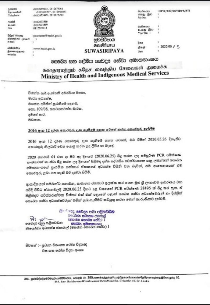 කොවිඩ්-19 ආසාදිතයින් සම්බන්ධ නොවන, සාමාන්ය ජනතාව ඉලක්ක කරගෙන මුළු දිවයිනම ආවරණය වන පරිදි විවිධ අවස්ථාවලදී 2020.06.25 වැනි දිනට දළ වශයෙන් PCR පරීක්ෂණ 28,496ක් සිදුකර ඇති බව වෛද්ය පබා පළිහවඩන – නියෝජ්ය අධ්යක්ෂ ජනරාල් (මහජන සෞඛ්ය සේවා) විසින් හෙළිකර ඇත.