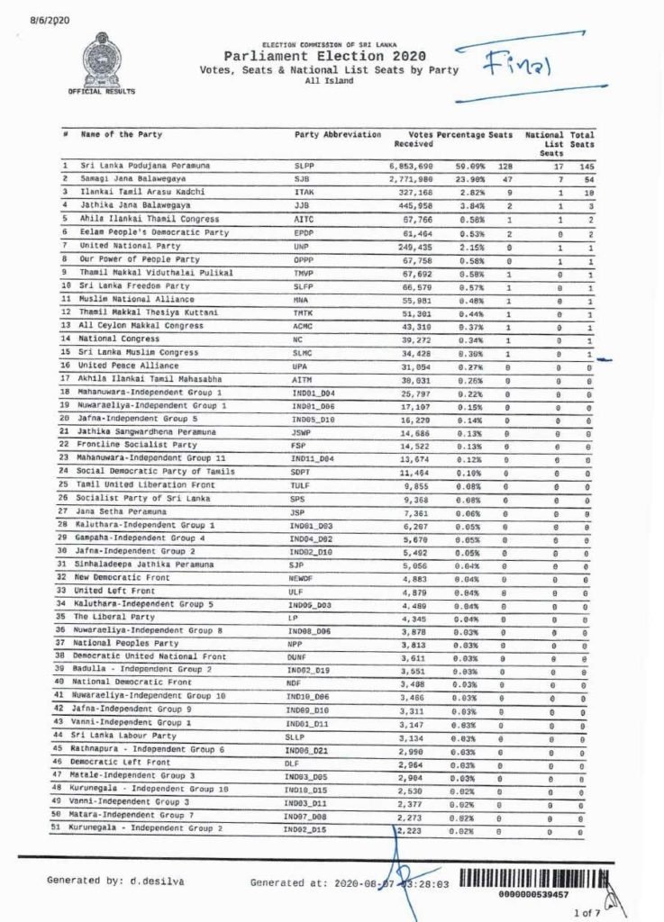 2020 මහ මැතිවරණයේ සමස්ත ඡන්ද ප්‍රතිඵලය මේ වන විට නිකුත් වී අවසන්ය. මහ මැතිවරණය අවසන් වූයේ ශ්‍රී ලංකා පොදුජන පෙරමුණට පාර්ලිමේන්තු මන්ත්‍රී ආසන 225 න් 145 කම ජයග්‍රහණය අත්පත් කර දෙමිනි. එය ඡන්දයෙන් තේරී පත්වූ මන්ත්‍රී ආසන 128කින් සහ ජාතික ලැයිස්තු මන්ත්‍රී ආසන 17 කින් සමන්විත විය.