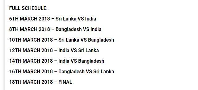 පළමු තරගය ශ්රී ලංකාව සහ ඉන්දියාව අතර ලබන මාර්තු මස 6 වැනිදා පැවැත්වෙනවා. අවසන් මහා තරගය පැවැත්වෙන්නේ මාර්තු මස 18 වැනිදායි.