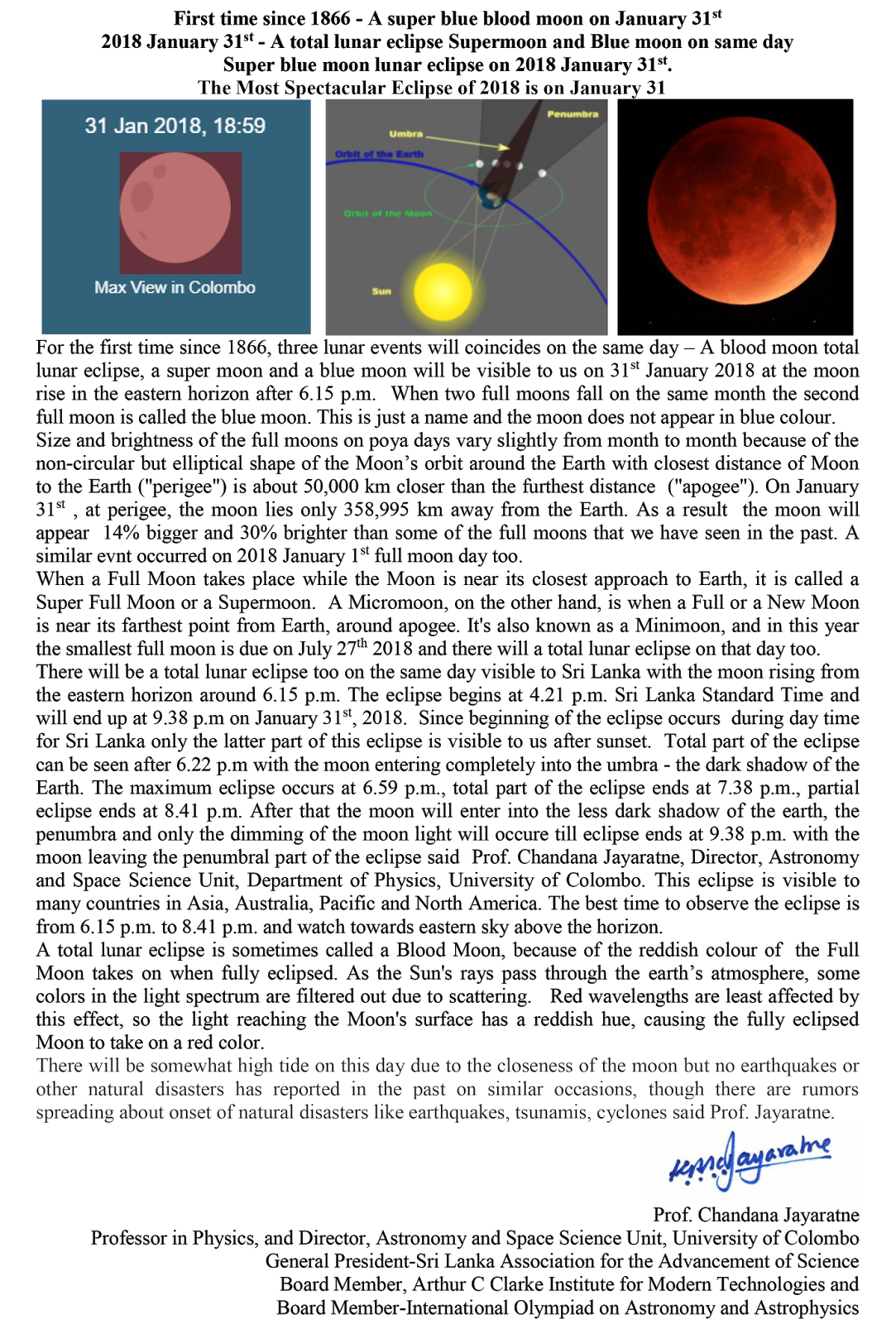 අවසන් වරට මෙවැනි සුපිරි නීල සඳක් සහ පූර්ණ චන්ද්ර ග්රහණයක් ලෝක වාසීන්ට දැක ගැනීමට හැකි වුයේ වසර 1866 දී බවයි කොළඹ විශ්ව විද්යාලය පවසන්නේ.