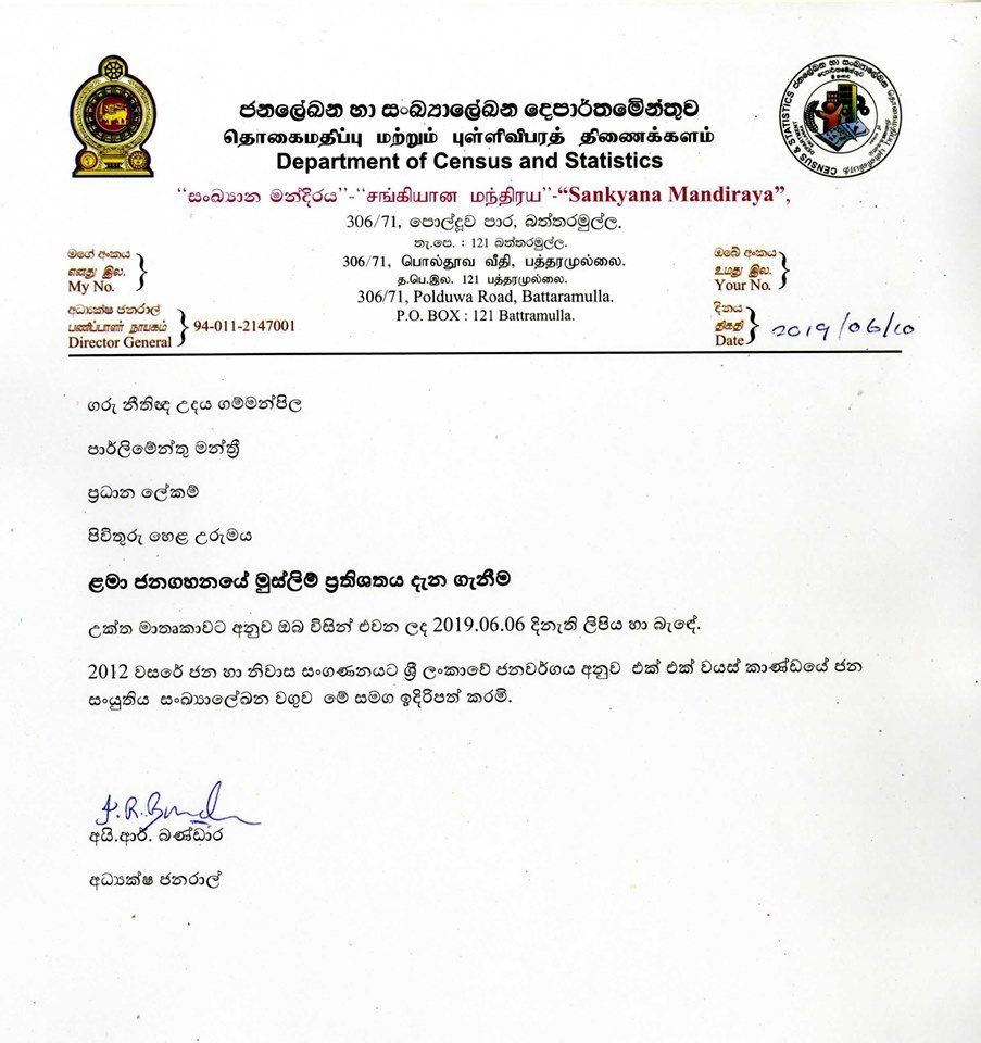 මුස්ලිම් ළමා ජනගහනය පිළිබඳ විවිධ කටකතා යනවා. සමහරු කියනවා ළමා ජනගහනයේ මුස්ලිම් ප්‍රතිශතය 42%යි කියලා. නමුත් මේ කතා කියන්නේ මූලාශ්‍ර පදනම් කරගෙන නොවේ. මුස්ලිම් ජනගහනයේ සීඝ්‍ර වර්ධනය තිබෙන බවත් ඇත්තක්. නමුත් ජන සහ සංඛ්‍යා ලේඛණ දෙපාරතමේන්තුව ළමා ජනගහනය ජනර්වග අනුව වාරතා කරන්නේ නැති නිසා මේ පිළිබඳ විශ්වාසනීය තොරතුරු සමාජයේ නෑ. මේ නිසා 2012 ජන සංගණනයේ තොරතුරු පදනම් කරගෙන ළමා ජනගහනයේ ජනවාරගික සංයුතිය සකසා දෙන්න කියා මම ජන සහ සංඛ්‍යා ලේඛණ දෙපාරතමේන්තුවේ අධ්‍යක්ෂ ජනරාල් ඉන්දු බණ්ඩාර මහත්මියගෙන් ඉල්ලීමක් කළා. මගේ ඉල්ලීමට අනුව එතුමියගේ ප්‍රතිචාරය දක්වා තිබෙනවා. එම ලිපි දෙකම මා ඔබ හමුවේ තබනවා.