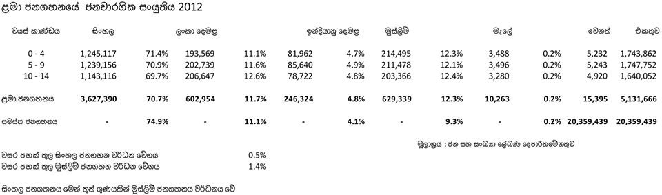 2012 දී සමස්ත ජනගහනයෙන් 75%ක් සිංහල, 11%ක් ලංකා දෙමළ, 4%ක් ඉන්දියානු දෙමළ සහ 9%ක් මුස්ලිම්. ඒ වසරේ දීම ළමා ජනගහනයෙන් 71%ක් සිංහල, 12%ක් ලංකා දෙමළ, 5%ක් ඉන්දියානු දෙමළ සහ 12%ක් මුස්ලිම්. සමස්ත ජනගහනයට සාපේක්ෂව ළමා ජනගහනයේ දී ලංකා දෙමළ, ඉන්දියානු දෙමළ සහ මුස්ලිම් කියන ජනර්වගවල ප්‍රතිශතය ඉහළ ගිහින්. නමුත් සිංහල පමණක් 75% සිට 71% දක්වා 4%කින් අඩු වෙලා. වැඩිම ර්වධන වේගයක් පෙන්වන්නේ මුස්ලිම්. මුස්ලිම් ජනගහනය 9% සිට 12% දක්වා වැඩි වෙලා. 9 සහ 12 කුඩා ඉලක්කම් ලෙස පෙනුනත් එය බරපතල වර් ධණයක්. 33% වඩා වැඩි වර්ධණයක්.