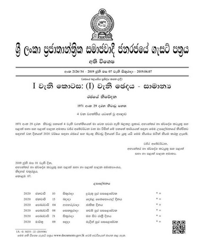 අභ්යන්තර හා ස්වදේශ කටයුතු සහ පළාත් සභා හා පළාත් පාලන අමාත්යංශය විසින් 2020 වසර සඳහා වන රජයේ හා බැංකු නිවාඩු දිනයන් පිළිබඳ අති විශේෂ ගැසට් නිවේදනය නිකුත් කර තිබෙනවා.
