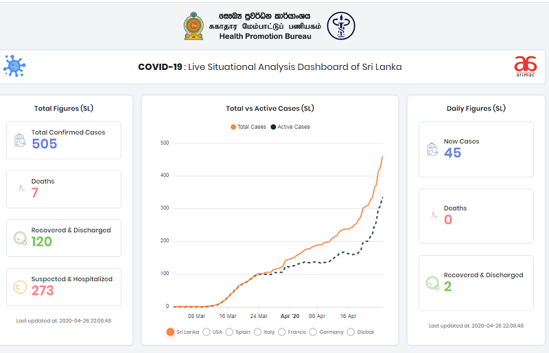 ශ්රී ලංකාවේ කොවිඩ්-19 ආසාදනය වූ රෝගීන් 45 දෙනකු අද (26) දිනය තුළ වාර්තා වීම සමග සමස්ත රෝගීන් සංඛ්යාව 505 දක්වා වර්ධනය වූ බව සෞඛ්ය ප්රවර්ධන කාර්යාංශයේ නිල වෙබ් අඩවියේ අද දින ප.ව 22.04ට සිදුකළ යාවත්කාලීන කිරීම්වල සදහන් වේ.