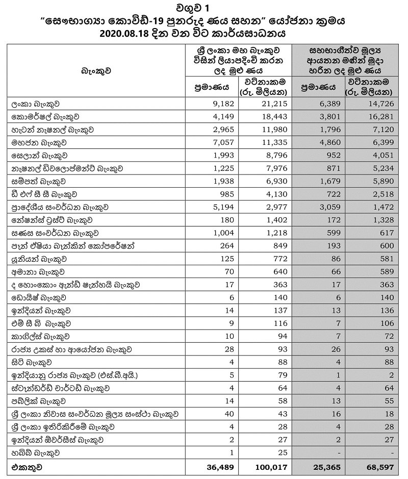 ඉහත පහසුකම යටතේ බලපත්රලාභී බැංකු මඟින් අයදුම් කරන ලද ණය අයදුම්පත් 36,489ක් සඳහා රුපියල් මිලියන 100,017ක් අනුමත කරමින් ශ්රී ලංකා මහ බැංකුව 2020 අගෝස්තු 18 වන දිනට රුපියල් බිලියන 100ක ණය කඩඉම අභිබවා යන ලදී. අනුමත ණයවලින් බලපත්රලාභී බැංකු 2020 අගෝස්තු 18 වන විට දිවයින පුරා පීඩාවට පත් ව්යාපාර සහ පුද්ගලයින් 25,365ක් අතර බිලියන 68.5ක් මුදා හැර ඇත. (විස්තර සඳහා 1 වන වගුව බලන්න).