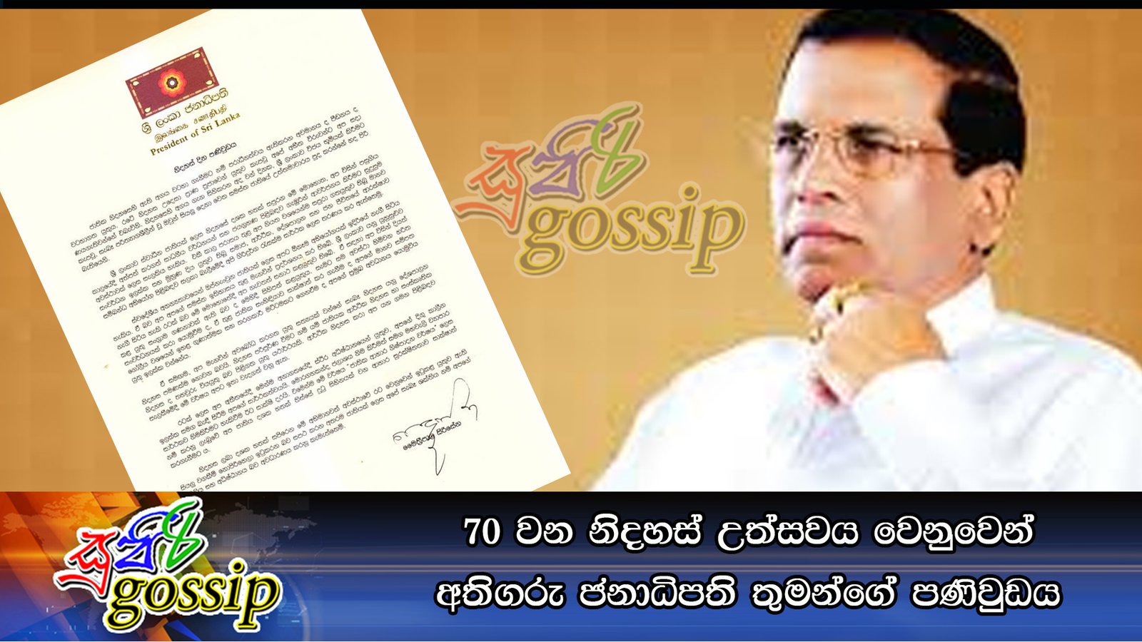 අප රටට නිදහස ලැබී වසර 70ක් සපිරෙන අද දිනට ඒ උදෙසා වත්මන් ජනාධිපති මෛත්රීපාල සිරිසේන මහතා විසින් රට වැසියන් වුදෙසා පණිවිඩයක් නිකුත් කරඇත.