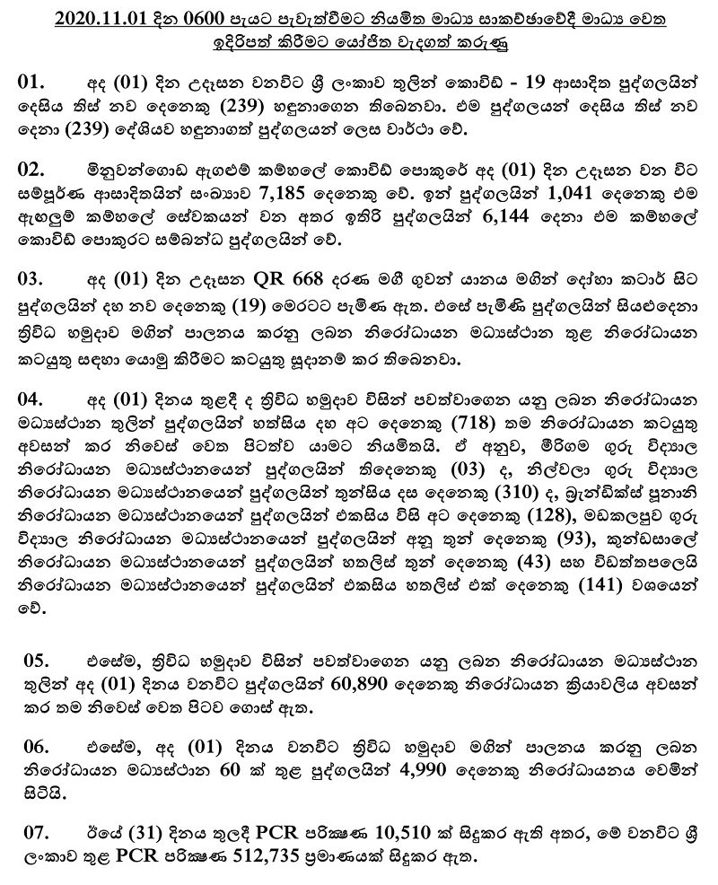 කොවිඩ්-19 පැතිරීම වැළැක්වීමේ ජාතික ක්රියාන්විත මධ්යස්ථානය විසින් අද (01) දින පෙරවරුවේ ශ්රී ලංකාවේ කොවිඩ් ව්යාප්තිය සම්බන්ධයෙන් වන නිල නිවේදනය නිකුත් කර තිබෙනවා. කරුණු 08ක් මත පදනම් වූ එම නිල නිවේදනය සම්පූර්ණයෙන්ම පහත පළ වෙනවා.