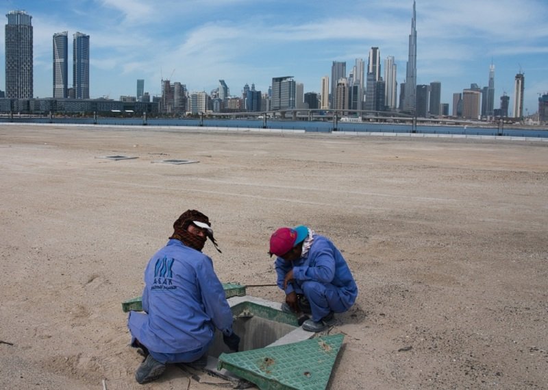2020 අප්‍රියෙල් 6 වන සඳුදා එක්සත් අරාබි එමීර් රාජ්‍යයේ ඩුබායි හි ඉදිකිරීම් කම්කරුවන් දෙදෙනෙකු ලොව උසම ගොඩනැගිල්ල වන බර්ජ් කලීෆා සමඟ ජලාපවහන පද්ධතියක් පරීක්ෂා කරති. ඩුබායි, ඉන් එකක්