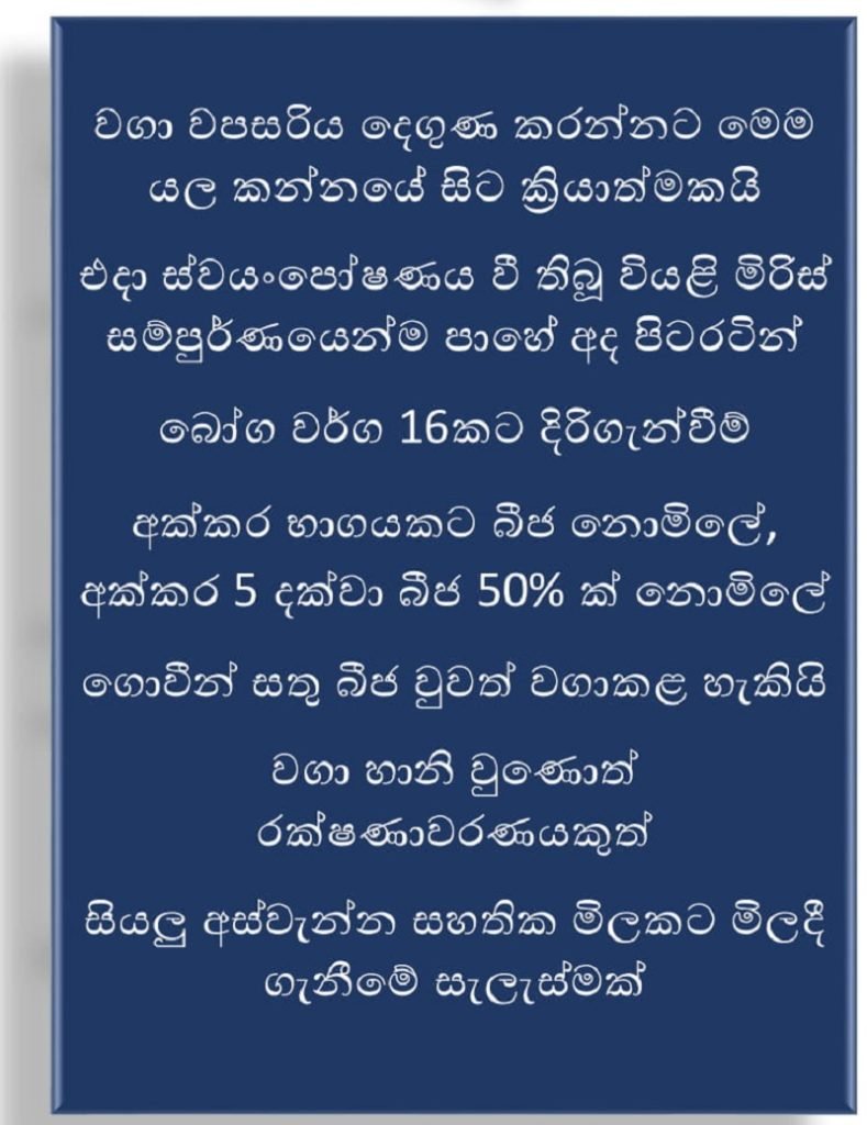 අක්කර කාලක් හෝ ඉන් ඔබ්බට අක්කර භාගයක් දක්වා ඉහත සඳහන් බෝග තනි වගාවක් වශයෙන් වගා කරන්නේ නම් රජය මගින් සම්පුර්ණ බීජ වියදම දරාගැනීමට මේ වනවිට තීරණය කර තිබේ.